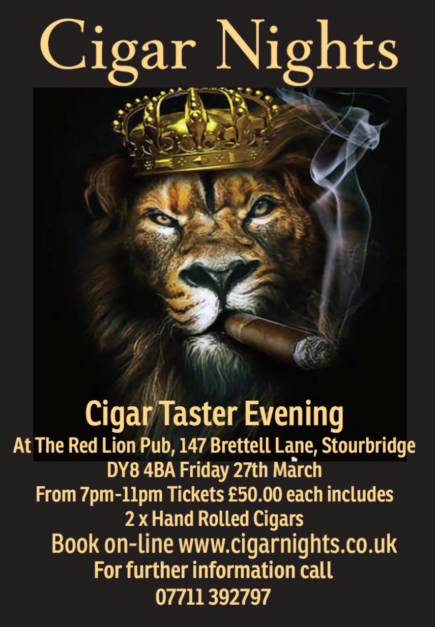 Cigar Taster Evening Ticket at the Red Lion Amblecote Friday 27th March 20261 x Cigar Taster Evening Ticket at the Red Lion 147 Brettell Lane, Amblecote, Stourbridge, West Midlands Friday 27th March 2026 From 7pm -11pm Ticket includes 2 x Hand Rolled Cigars ( Brands To Be Confirmed Soon )