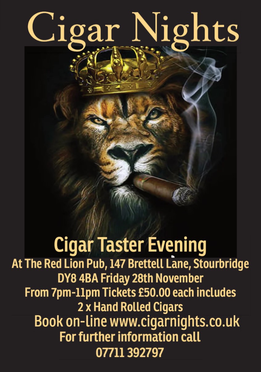 1 x Ticket for Cigar Taster Evening at the Red Lion Pub 147 Brettel Lane, Amblecote, Stourbridge DY8 4BA on Friday 28th November 2025 from 7pm -11pm Price included two hand rolled cigars for this event we will joined by Michal Pasternak from Davidoff UK